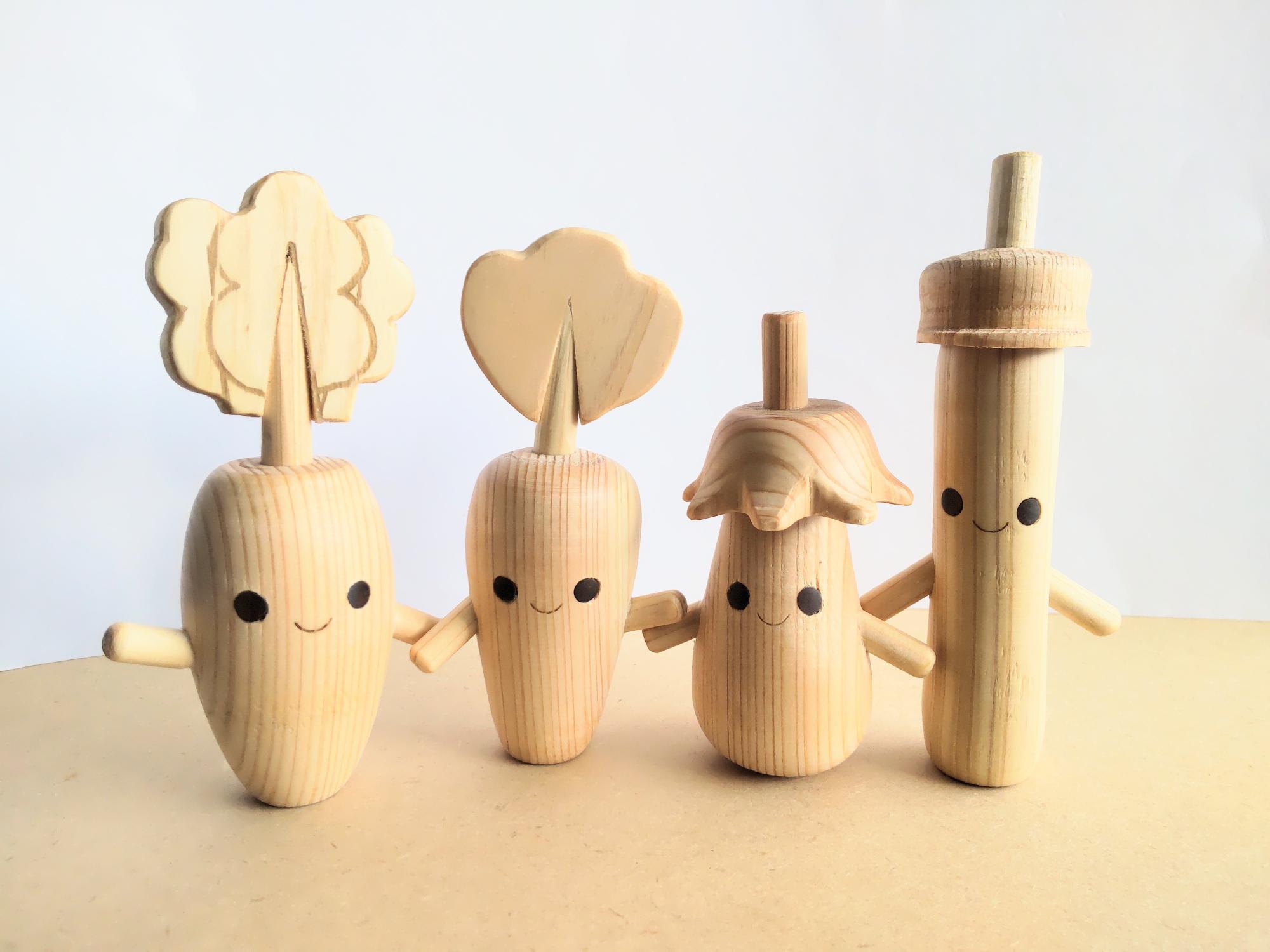 不思議な世界で野菜の妖精たちと名前探しをするお話です。物語の妖精たちが「Mamie & Papi」の木のおもちゃになりました。