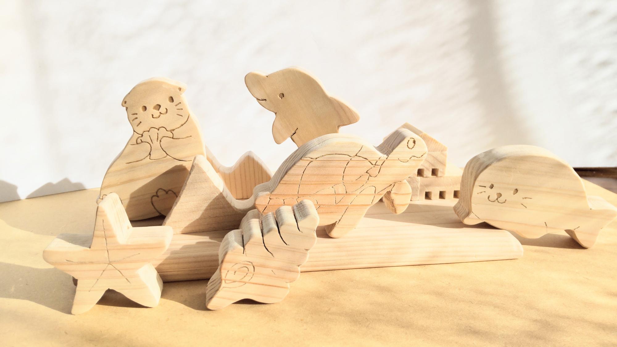「オホーツクうみの学校」は、流氷の海にある架空の学校を舞台にした物語です。登場する海の仲間たちを糸のこ細工で木のおもちゃにしました。
